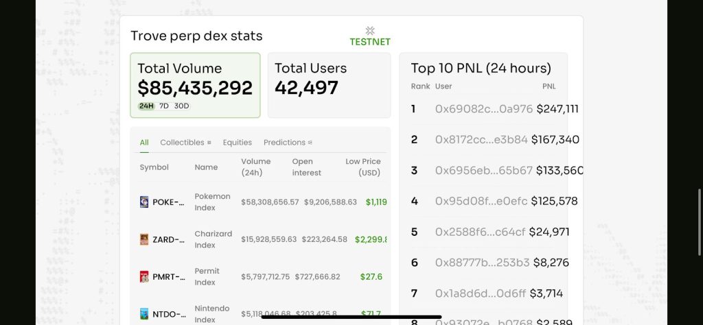 Trove Markets has also demonstrated notable early adoption. On its testnet, the perpetual DEX recorded $81.38 million in trading volume.