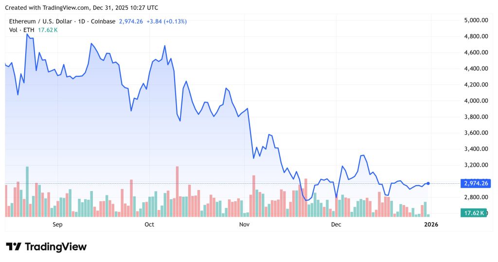 Meanwhile, Ethereum is changing hands around $2,974, showing early signs of stabilization after a sharp multi-month decline. The chart highlights a steady downtrend from September highs above $4,500, followed by a sharp breakdown in November and choppy recovery attempts through December. ETH recently bounced from lows near $2,800, but upside momentum remains limited.