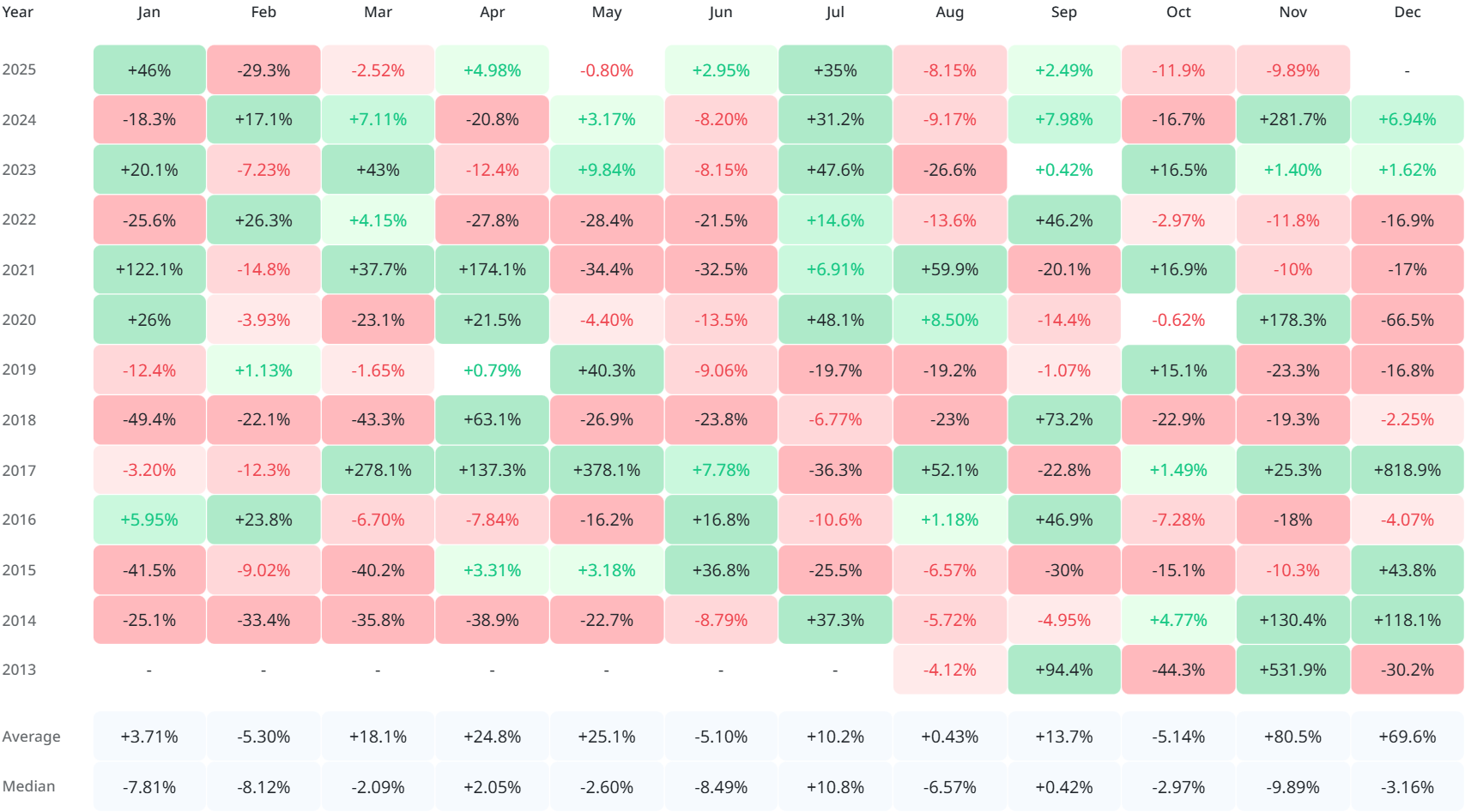 The chart shows a more consistent pattern of month-to-month returns in comparison to XRP. Months of gain are more frequent on the coin than on XRP, and periods of extreme loss are fewer. This pattern reflects more consistent demand, derived from the asset’s expansive ecosystem, burn mechanism, and real-world utility.