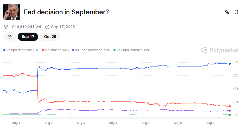 We move on to the potential lowering of interest rates in the United States. The latest jobs data report indicated that the economy is weaker than previously expected, which means the Federal Reserve might be more inclined to drop the benchmark. According to Polymarket, the odds of such a move coming in September have soared from 35% to almost 80%.