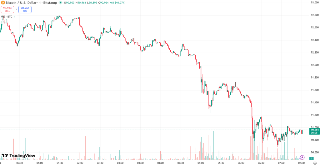 At the time of writing on Tuesday morning, BTC was changing hands at $91,020. The coin has traded mostly sideways over the past 24 hours, between the intraday high of $93,301 and $93,176. It has dipped to $90,765 earlier this morning.