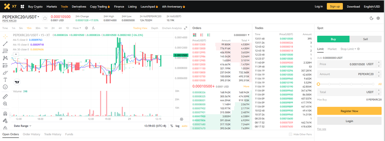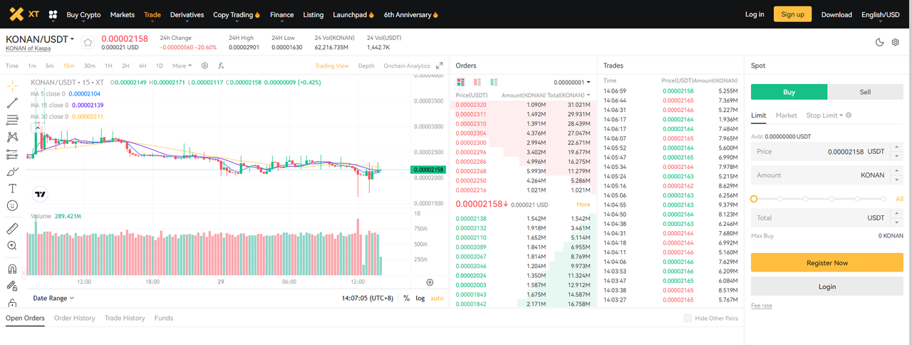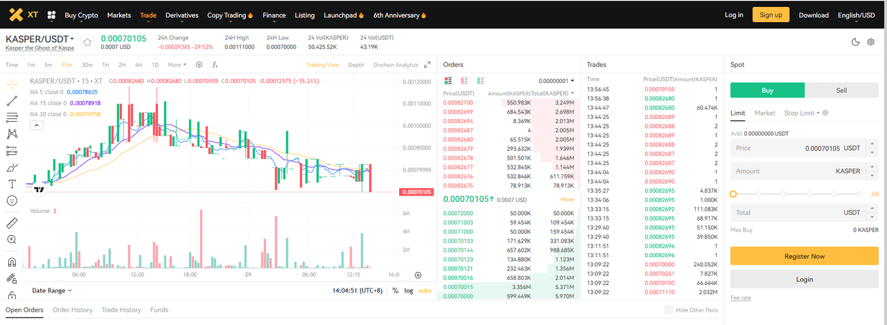Trading of KRC-20 tokens including PEPEKRC20KANGOBURTKASPYDOGKKONAN and KASPER against USDT (Tether) is now available on XT.COM, which provides a straightforward trading interface suitable for both beginners and experienced traders.